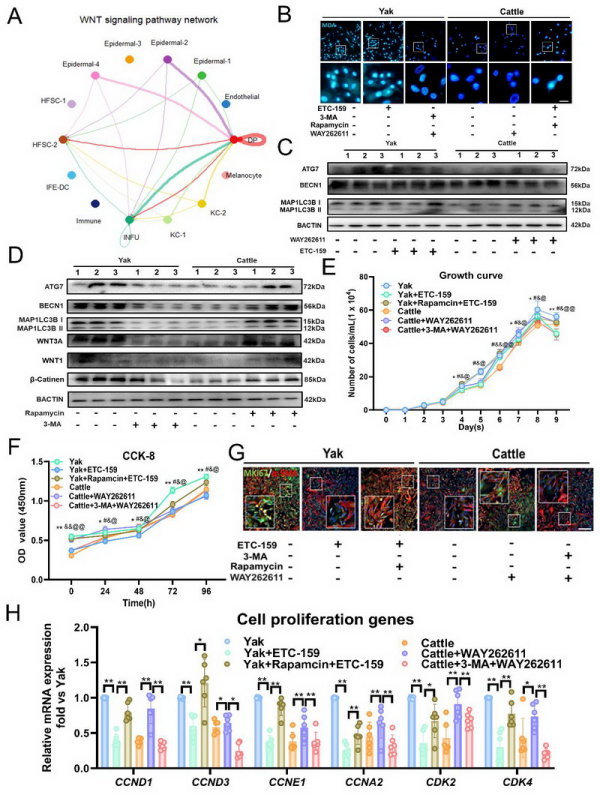 功能实验表明,自噬抑制剂3-MA处理后的牦牛DP细胞生长曲线和细胞活力显著下降,增殖标志物MKi67和PCNA的阳性率分别降低18.1%和22.6%。经自噬激活剂雷帕霉素处理后,普通牛DP细胞的增殖能力提升。WNT/β-Catenin通路在牦牛DP细胞中被抑制后会削弱细胞增殖能力,而在普通牛DP细胞中被激活后会提高细胞增殖能力。