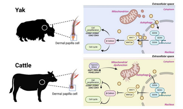 研究团队进一步发现,转录因子SOX4可直接结合WNT1WNT3A基因的启动子区域,且这一结合对基因的转录激活作用通过双荧光素酶实验得到验证。SOX4的表达受自噬水平调控,激活自噬可挽救SOX4抑制剂对DP细胞增殖的抑制作用。该调控通路在牦牛体中表现出更强的信号活性,通过促进DP细胞周期进程、增强细胞增殖能力来维持毛囊稳态。同时,该通路还能改善线粒体结构完整性以抵御氧化应激,从而可能促进毛囊生长,系统性增强牦牛对高原寒冷环境的生存适应能力。