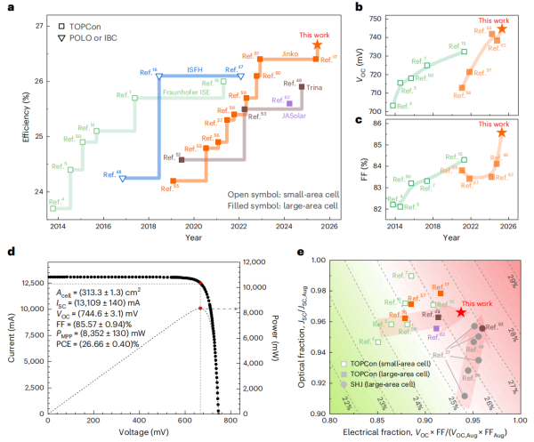 近日,凯发k8宁波材料技术与工程研究所团队等,提出了双面电学协同优化的新策略,实现了工业级TOPCon太阳能电池性能的突破。团队在工业标准M10尺寸(313.3 cm2)硅片上,制备出经认证转换效率达26.66%的TOPCon太阳能电池,创下了744.6 mV的工业级TOPCon开路电压新高,填充因子达85.57%,双面率提升至88.3%,其Voc×FF/理论极限值达93.8%。
