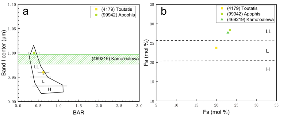 基于上述研究成果,研究团队进一步分析了多个小行星探测任务的目标天体。结果表明,美国NASA OSIRIS-APEX任务的目标——99942 Apophis,以及中国天问二号任务的目标——469219 Kamo‘oalewa,均为与LL型普通球粒陨石成分相似的S类近地小行星;嫦娥二号任务飞越探测的4179 Toutatis,其成分更接近L型普通球粒陨石。这一系列比对不仅验证了光谱分析方法的可靠性,也为我国未来小行星采样返回任务提供了重要的凯发k8依据。