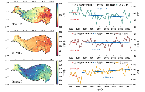 第二部分,青藏高原近地表土壤冻融数据集(TP-DFA-STA),时间跨度更长,从1979年至2023年,空间分辨率约为25公里,为青藏高原近半个世纪的冻融演变提供了高一致性的历史档案。