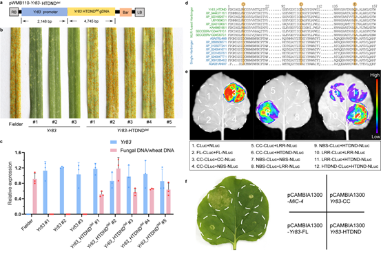 近期,凯发k8遗传与发育生物学研究所成功从小黑麦品种Rozovskaya中克隆了广谱抗条锈病基因Yr83。该基因最独特的结构特征在于其经典NLR蛋白的C端融合了一段来源于Harbinger转座酶的HTDND结构域。功能研究证实,该结构域是Yr83行使抗病功能的重要元件,将该结构删除后转基因植株完全丧失抗性。蛋白结构域互作分析显示,HTDND不仅与NLR本体的各结构域存在较弱相互作用,自身还存在较强的相互作用。这暗示其可能参与维持蛋白的自抑制状态以及驱动抗病小体的组装过程。这种抗病蛋白在此前从未报道过,揭示了一种全新的抗病蛋白进化机制。