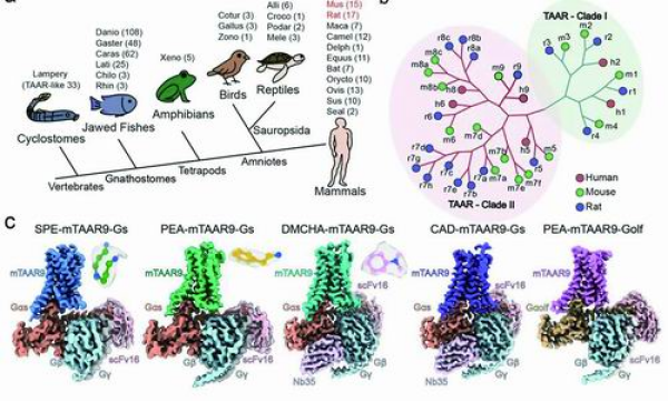山东大学教授孙金鹏团队和上海交通大学医学院研究员李乾团队合作,应用冷冻电镜技术解析了痕量胺相关受体(TAAR)家族成员之一的小鼠TAAR9(mTAAR9)受体在4种不同配体结合条件下与Gs/Golf(嗅觉特异性Gα)蛋白三聚体复合物的结构,进一步结合药理学分析揭示了mTAAR9感知配体后被激活的分子机制。同时,该研究也提出了嗅觉受体“组合编码”识别配体的结构机制,阐明了II类嗅觉受体独特的激活方式。